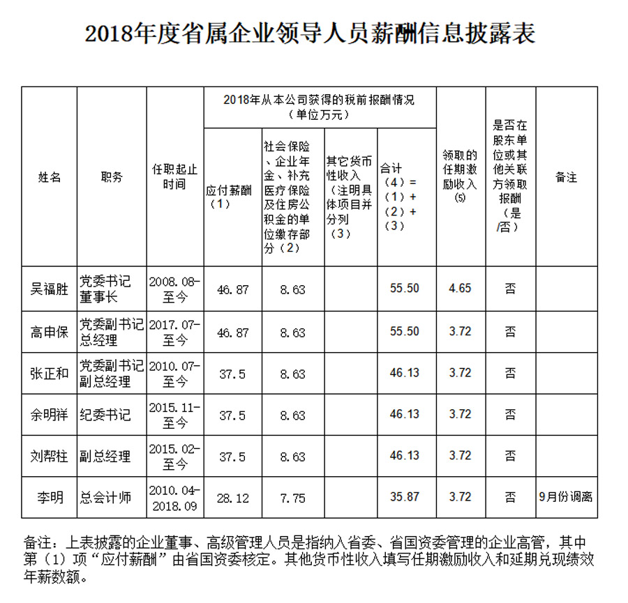 2018年度省屬企業(yè)引領(lǐng)人員薪酬信息披露表